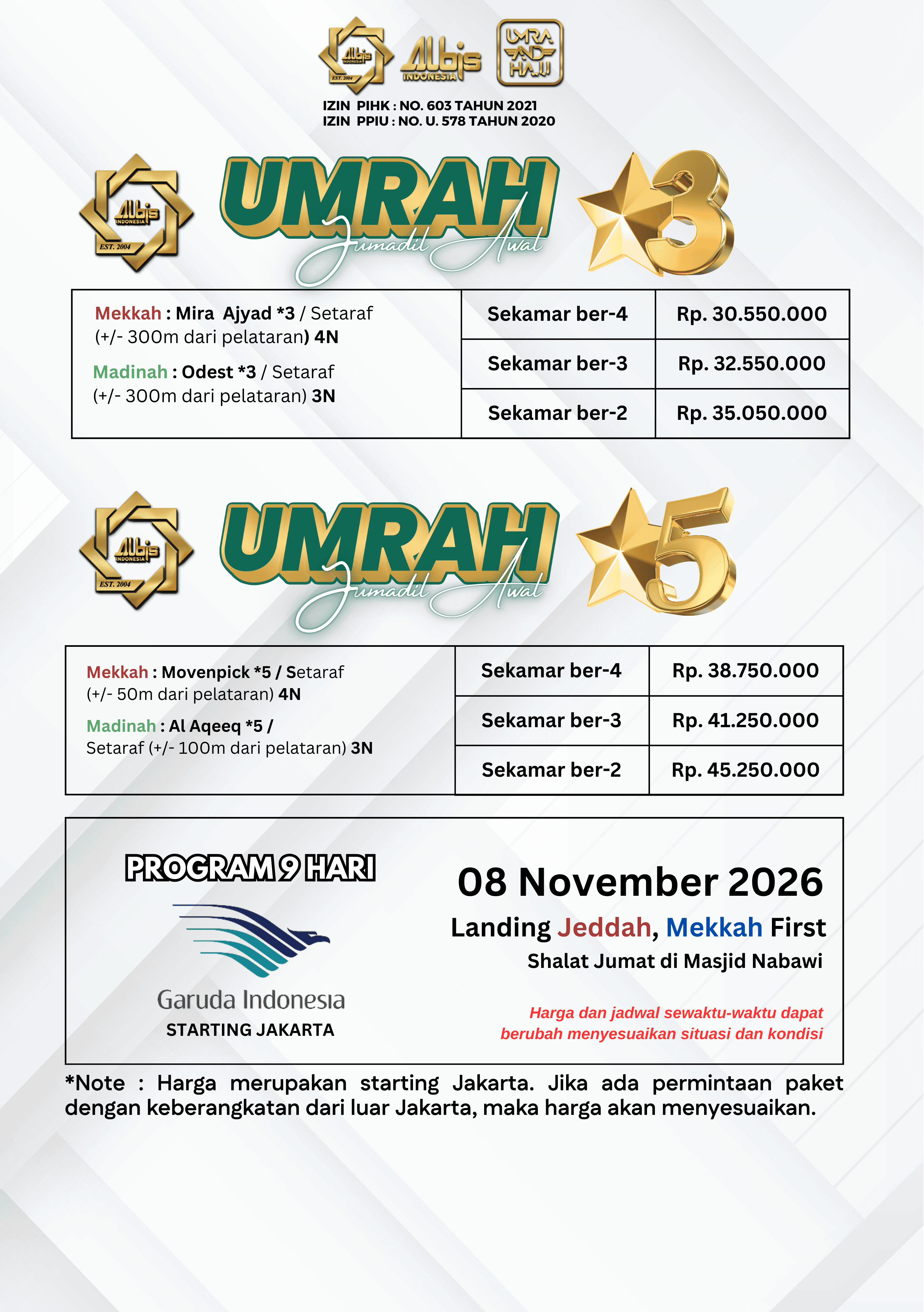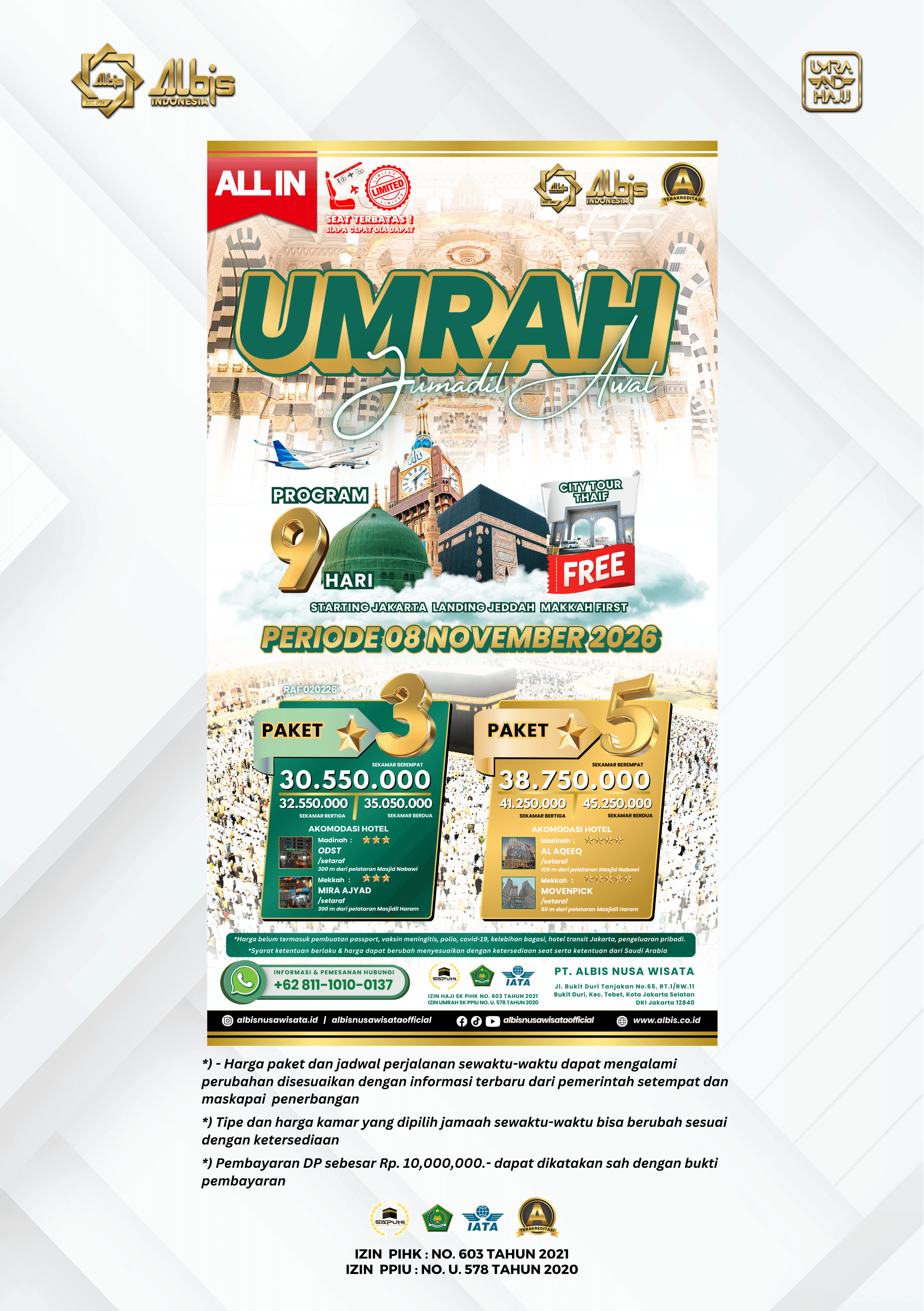 Paket Umrah yang ditawarkan oleh Albis adalah salah satu pilihan yang sangat menarik bagi mereka yang bercita-cita untuk melaksanakan ibadah Umrah ke Tanah Suci. Nikmati Perjalanan Spiritual yang Nyaman dan Memorable bersama Albis.