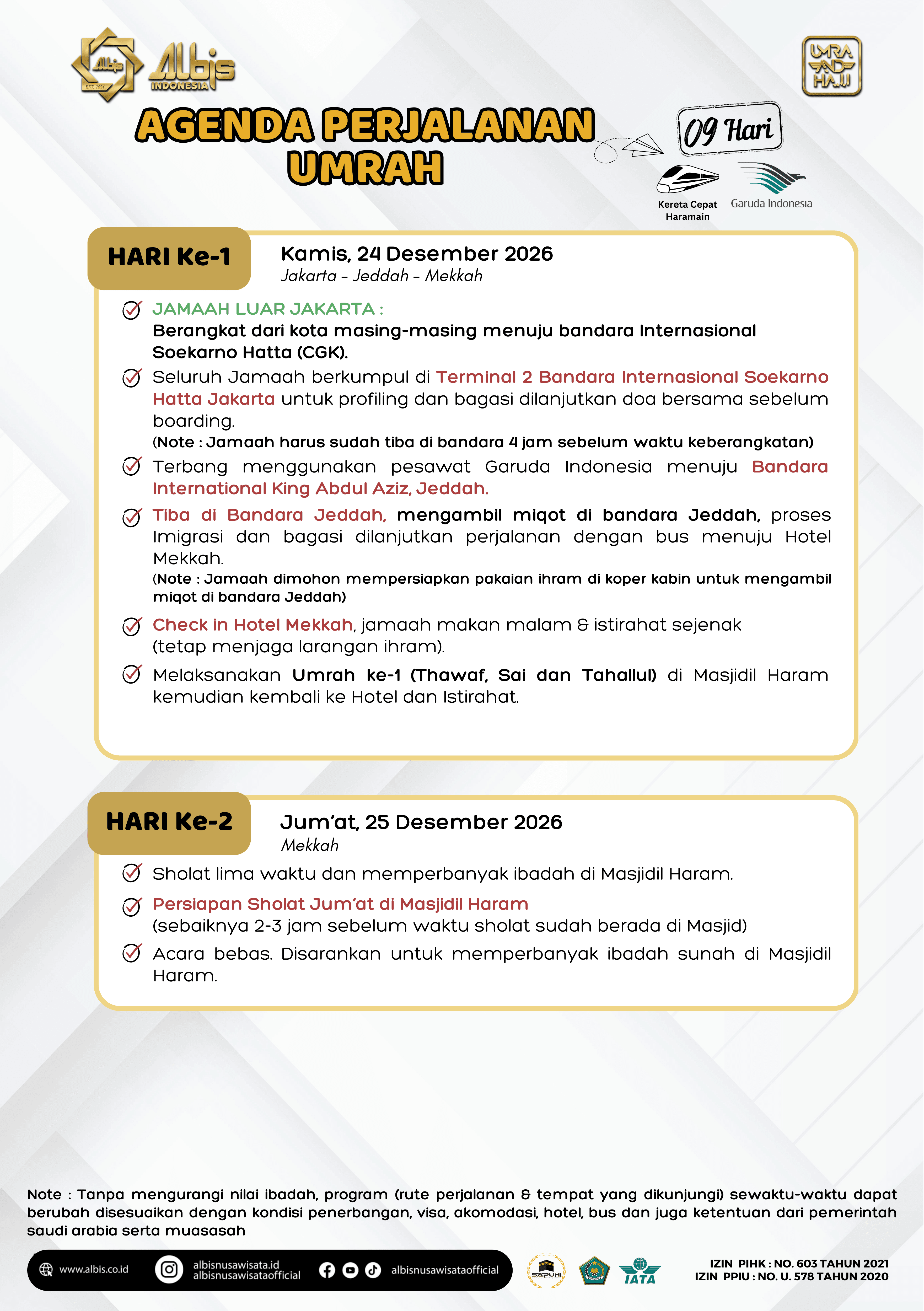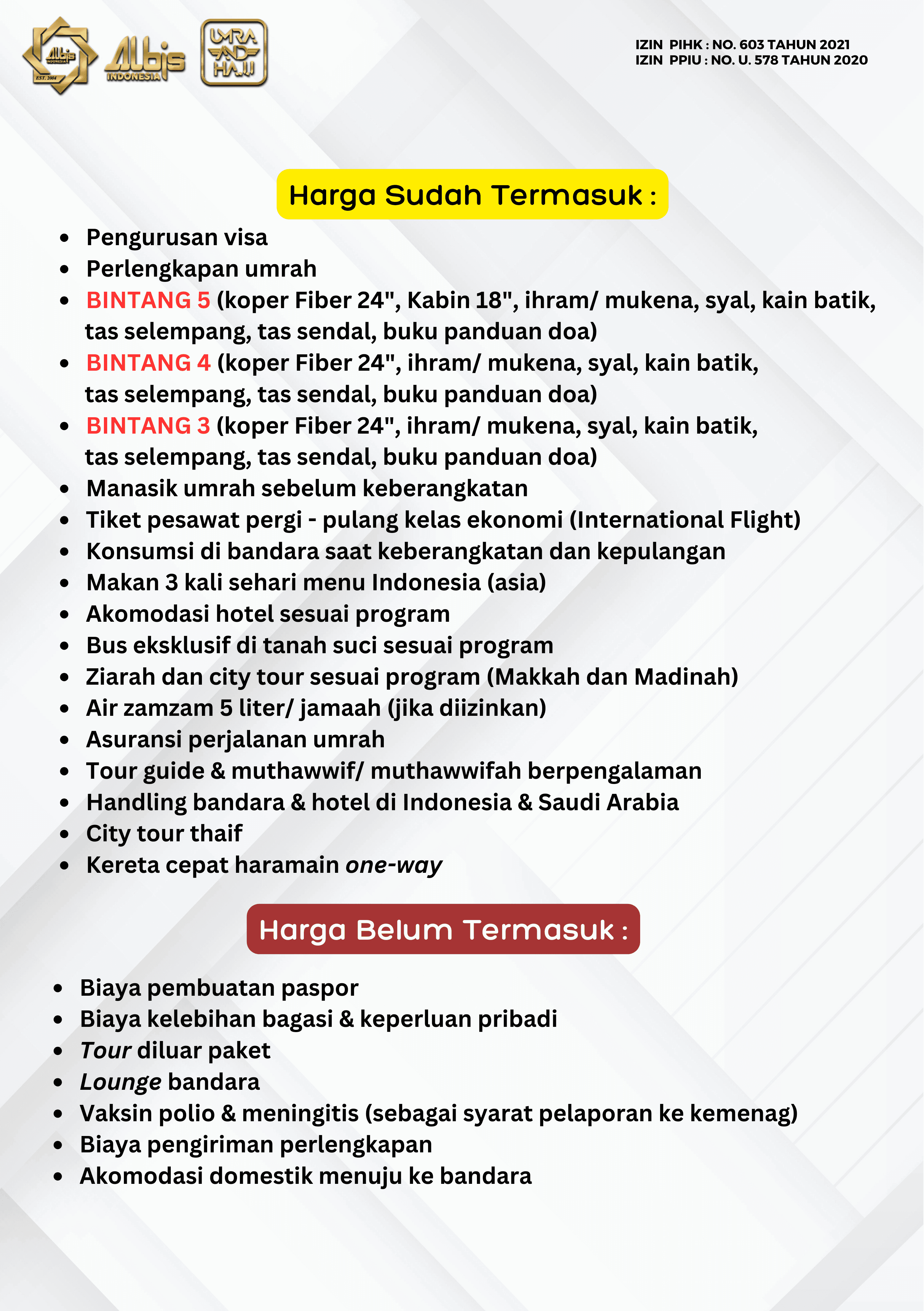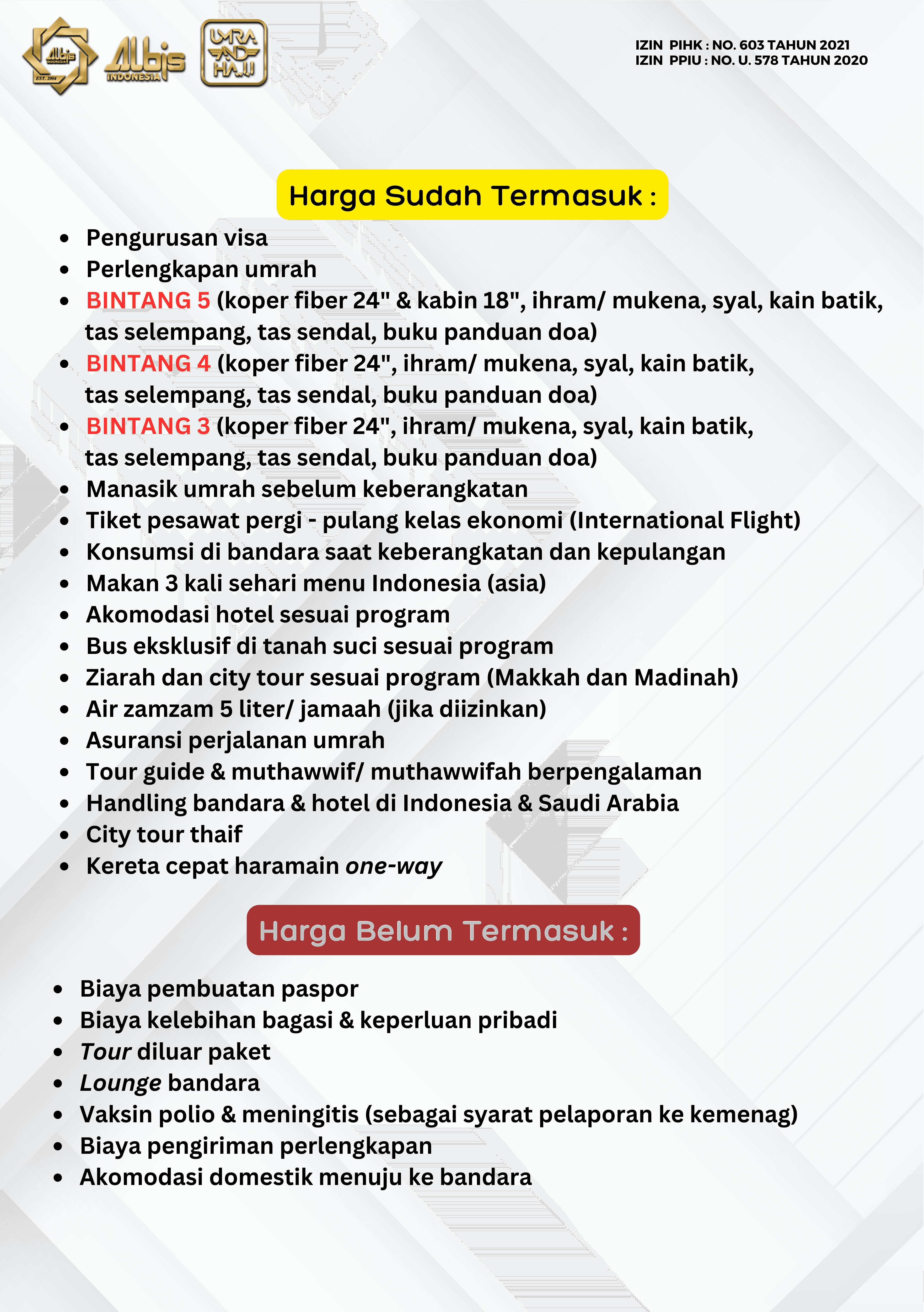 Paket Umrah yang ditawarkan oleh Albis sudah termasuk: